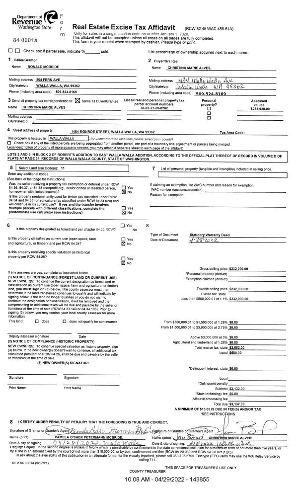 | 2 | 04/29/2022 | SWD | STATUTORY WARRANTY DEED | MC BRIDE RONALD | ALVES CHRISTINA MARIE | | | $232,000.00 | 143855 | 2022-03643 |