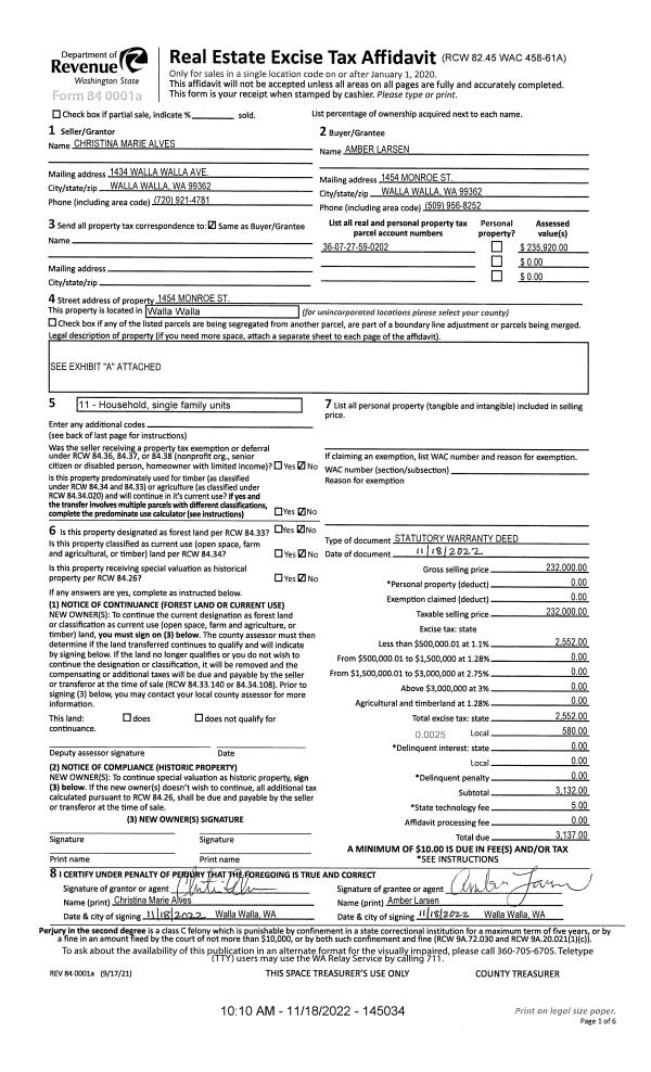 | 1 | 11/18/2022 | SWD | STATUTORY WARRANTY DEED | ALVES CHRISTINA MARIE | LARSEN AMBER | | | $232,000.00 | 145034 | 2022-09206 |