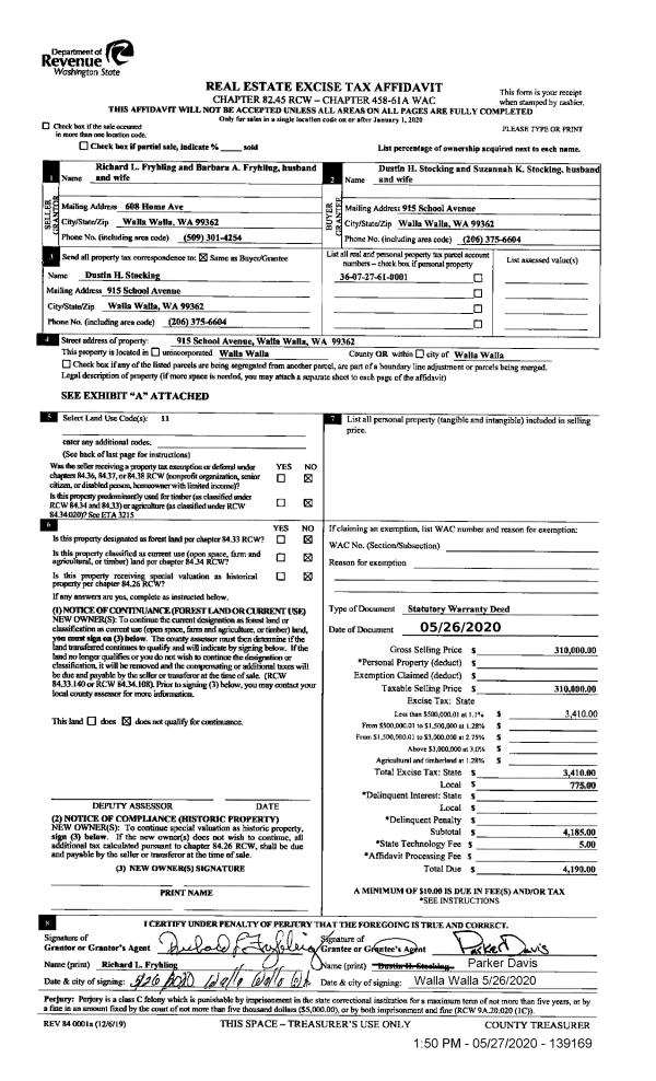 | 1 | 05/27/2020 | SWD | STATUTORY WARRANTY DEED | FRYHLING RICHARD L & BARBARA | STOCKING DUSTIN H & SUZANNAH K | | | $310,000.00 | 139169 | 2020-04641 |