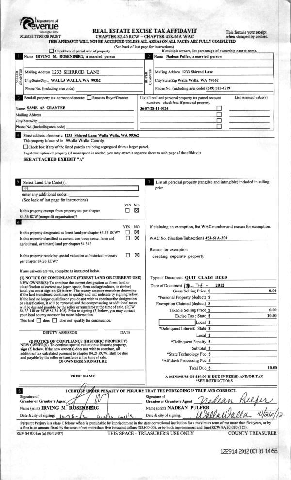 | 2 | 10/31/2012 | QCD | QUIT CLAIM DEED | ROSENBERG, IRVING M | PULFER, NADEAN | | | $0.00 | 122914 | 2012-09661 |