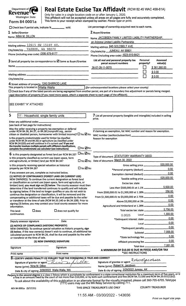 | 1 | 03/30/2022 | SWD | STATUTORY WARRANTY DEED | DILLON NINA M | JACOBSEN FAMILY LIMITED LIABILITY PARTNERSHIP | | | $520,000.00 | 143656 | 2022-02633 |