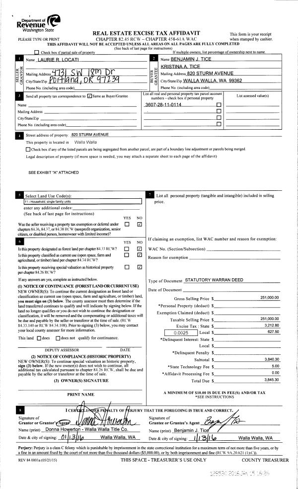 | 1 | 01/15/2016 | SWD | STATUTORY WARRANTY DEED | WUTHRICH LAURIE R | TICE BENJAMIN J & KRISTINA A | | | $251,000.00 | 129530 | 2016-00350 |