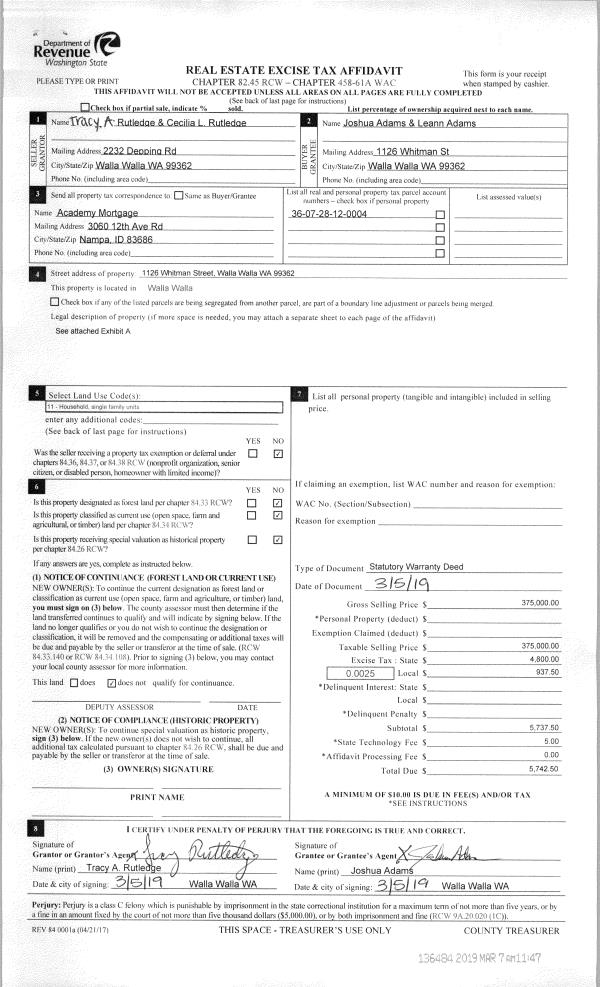 | 1 | 03/07/2019 | SWD | STATUTORY WARRANTY DEED | RUTLEDGE TRACY A & CECILIA L | ADAMS JOSHUA & LEANN | | | $375,000.00 | 136484 | 2019-01466 |