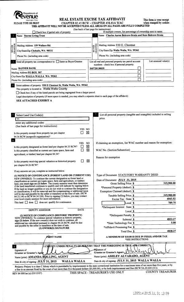 | 3 | 07/31/2015 | SWD | STATUTORY WARRANTY DEED | STORMS LIVING TRUST | BOBROW-STRAIN CHARLES AARON & KATE | | | $315,900.00 | 128514 | 2015-06598 |