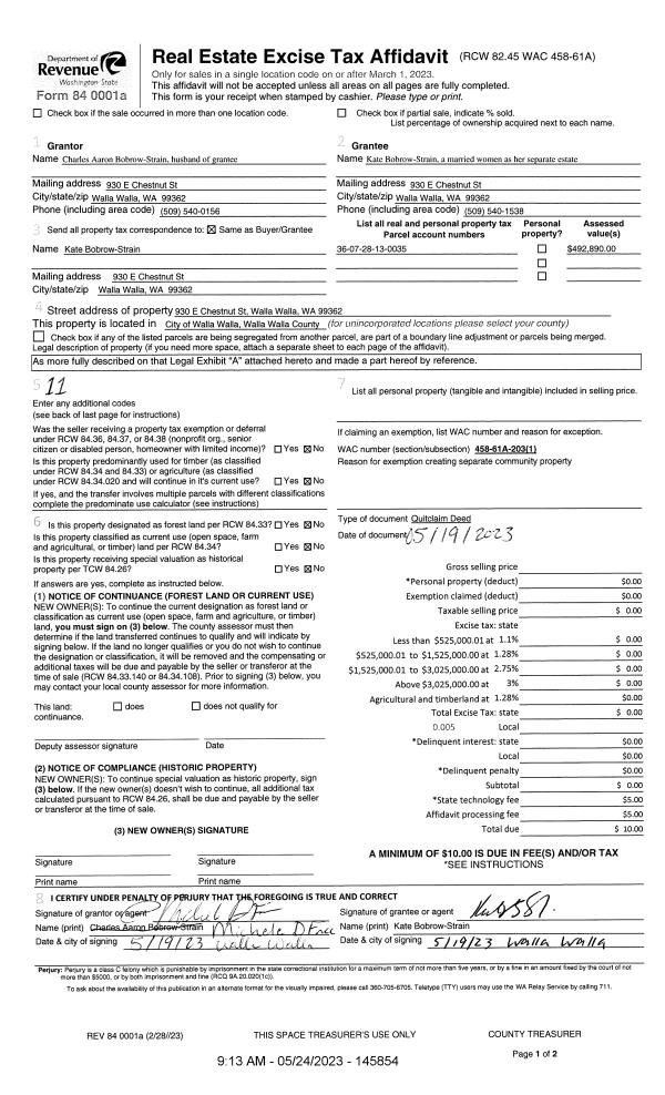 | 1 | 06/07/2023 | QCD | QUIT CLAIM DEED | BOBROW-STRAIN CHARLES AARON & KATE | BOBROW-STRAIN KATE | | | $0.00 | 145929 | 2023-03099 |