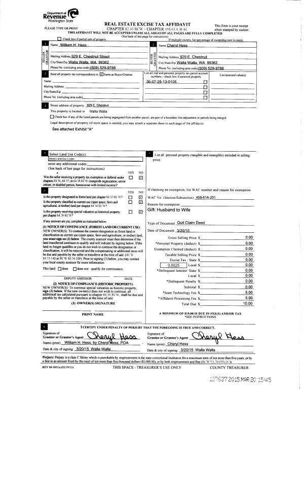 | 2 | 03/20/2015 | QCD | QUIT CLAIM DEED | HESS WILLIAM H & CHERYL | HESS CHERYL | | | $0.00 | 127637 | 2015-02331 |