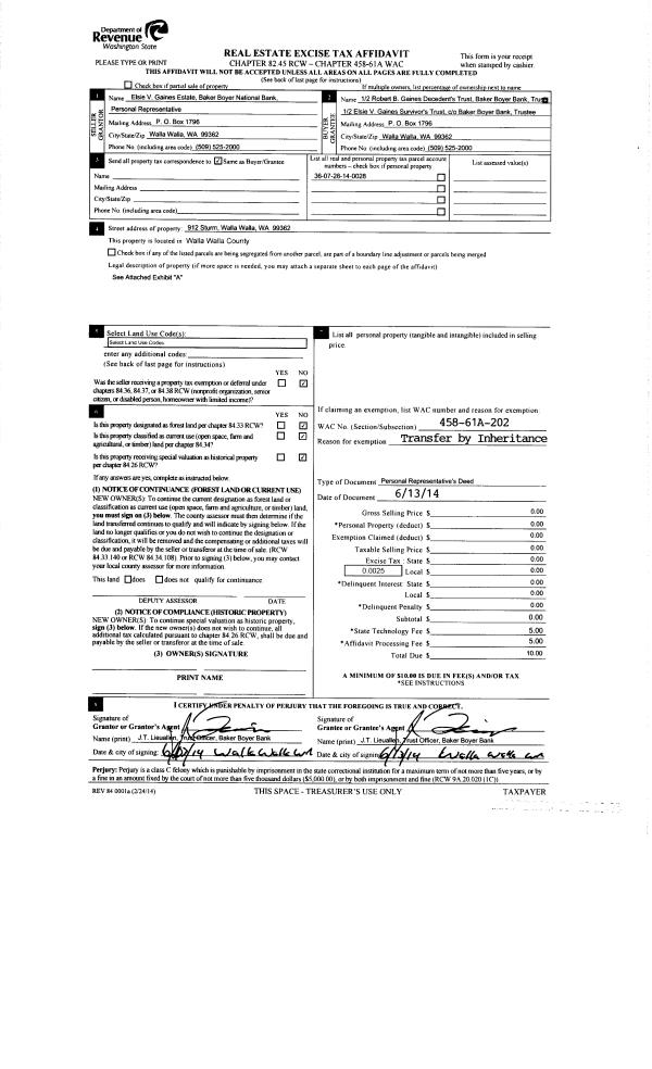 | 3 | 06/13/2014 | DPR | DEED OF PERSONAL REPRESENTATIVE | GAINES ROBERT & ELSIE TRUST | GAINES ROBERT & ELSIE TRUST | | | | 126072 | 2014-04097 |