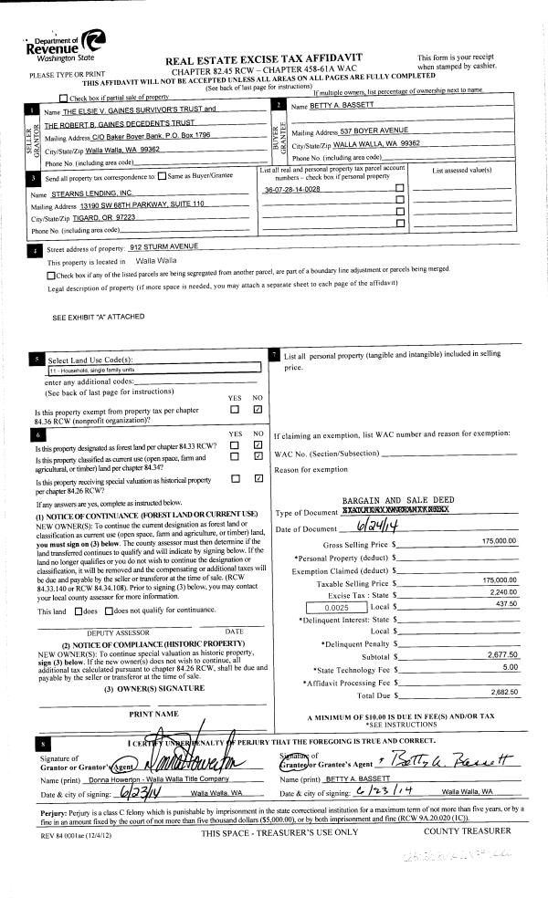 | 2 | 06/25/2014 | BARGAIN & | BARGAIN & SALE DEED | GAINES ROBERT & ELSIE TRUST | BASSETT BETTY A | | | $175,000.00 | 126131 | 2014-04381 |