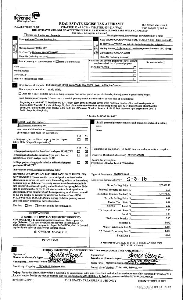 | 2 | 02/08/2016 | TRUSTEES D | TRUSTEE'S DEED | WOOD DONALD | WILMINGTON SAVING FUND SOCIETY FSB | | | $127,476.00 | 129640 | 2016-00953 |