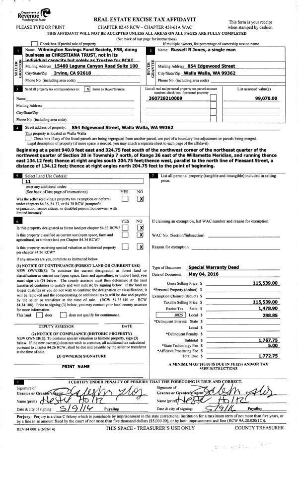| 1 | 05/10/2016 | SWP | Special Warranty Deed | WILMINGTON SAVING FUND SOCIETY FSB | JONES RUSSELL R | | | $115,539.00 | 130191 | 2016-03513 |