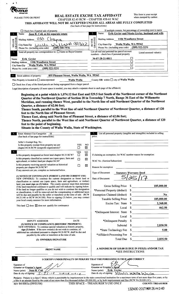 | 1 | 05/26/2017 | SWD | STATUTORY WARRANTY DEED | COLL JUAN R | GRYLER ERIK & NICOLE | | | $185,000.00 | 132480 | 2017-04021 |