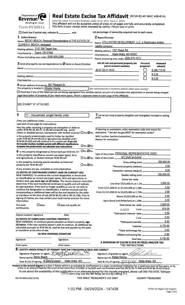 | 1 | 04/24/2024 | DPR | DEED OF PERSONAL REPRESENTATIVE | BEACH GLENDA K ESTATE OF | STILLWATER DEVELOPMENT LLC | | | $350,000.00 | 147438 | 2024-02067 |