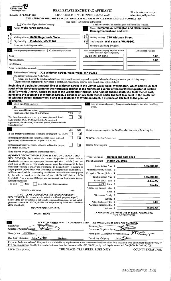 | 1 | 05/27/2015 | BARGAIN & | BARGAIN & SALE DEED | WELLS FARGO BANK NA CUSTOMER SERVICE | REMINGTON BENJAMIN A | | | $165,000.00 | 128045 | 2015-04473 |
