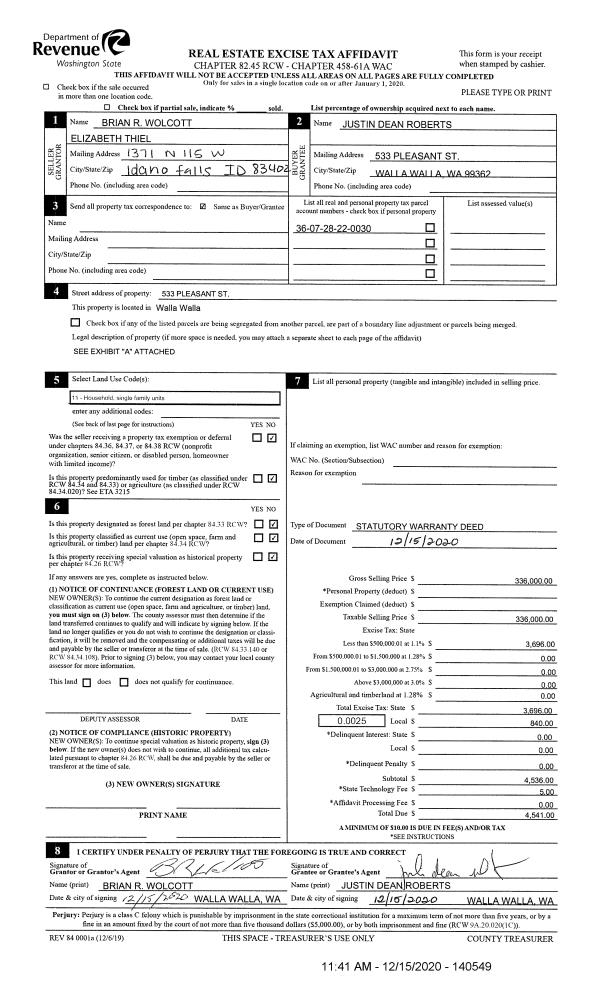| 1 | 12/15/2020 | SWD | STATUTORY WARRANTY DEED | WOLCOTT BRIAN | ROBERTS JUSTIN DEAN | | | $336,000.00 | 140549 | 2020-13260 |
