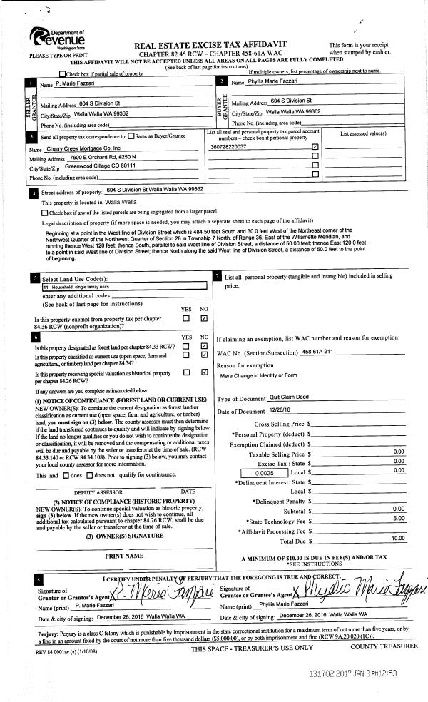 | 2 | 12/26/2016 | QCD | QUIT CLAIM DEED | FAZZARI P MARIE | FAZZARI PHYLLIS MARIE | | | $0.00 | 131702 | 2017-00018 |