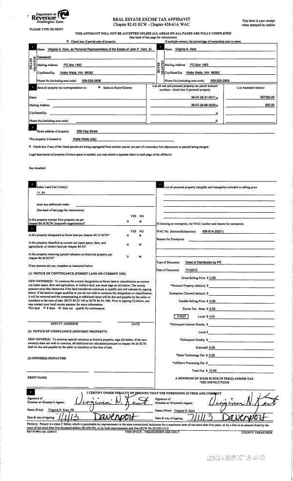 | 3 | 07/01/2013 | DPR | DEED OF PERSONAL REPRESENTATIVE | KENT JOHN P SR ESTATE | KENT VIRGINIA N | 2 PARCELS | | | 129024 | 2015-09148 |