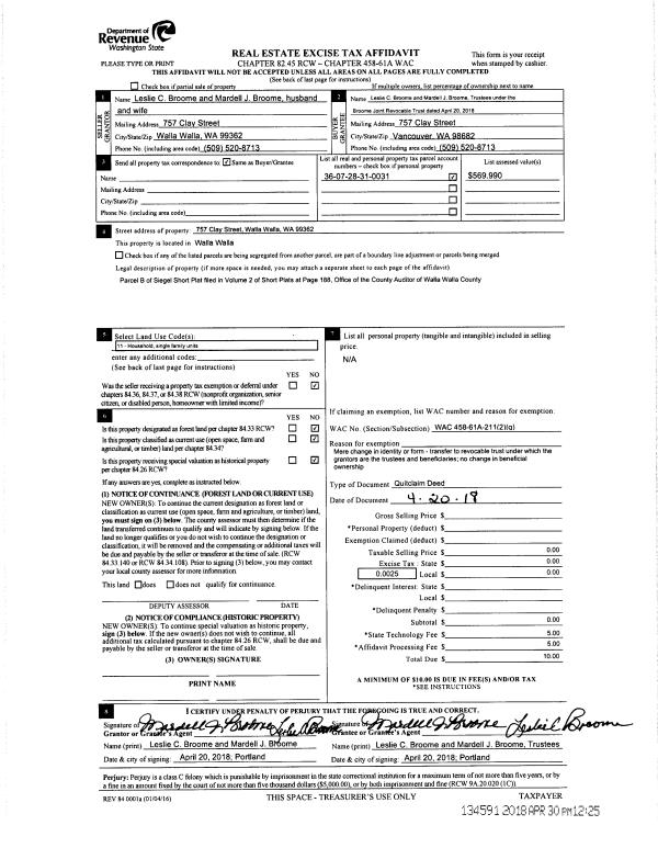 | 1 | 04/30/2018 | QCD | QUIT CLAIM DEED | BROOME LESLIE & MARDELL | BROOME JOINT REVOCABLE TRUST | | | $0.00 | 134591 | 2018-03367 |