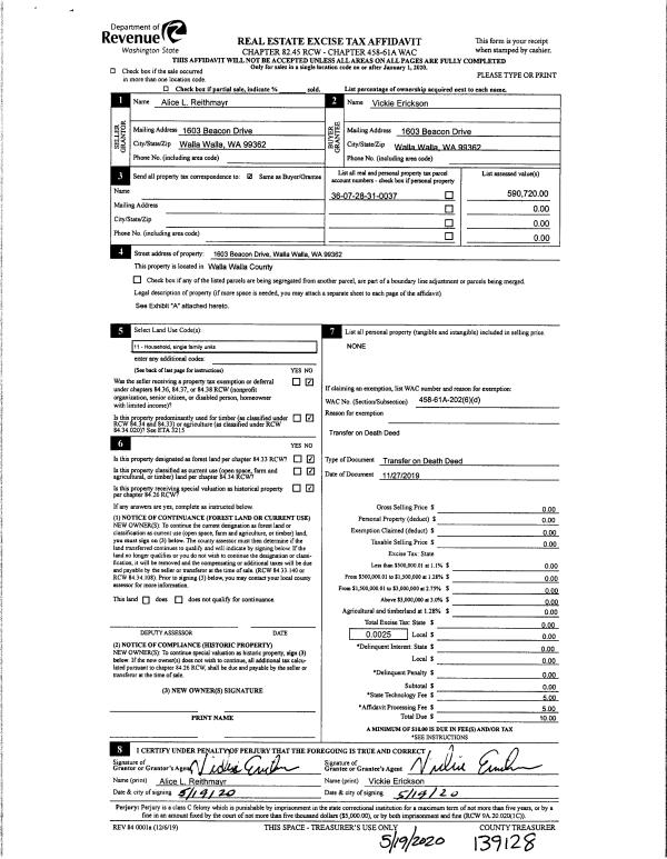 | 2 | 11/27/2019 | DEATH CERT | DEATH CERTIFICATE | REITHMAYR ALICE L | ERICKSON VICKIE | | | $0.00 | 139128 | 2020-04374 |