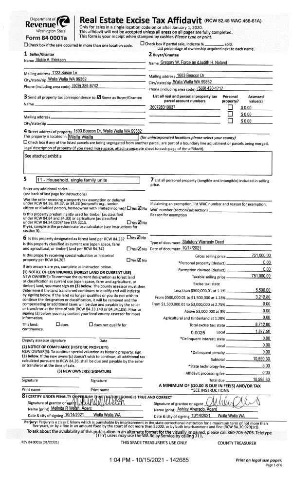 | 1 | 10/15/2021 | SWD | STATUTORY WARRANTY DEED | ERICKSON VICKIE | FORGE GREGORY W & JUDITH H NOLAND | | | $751,000.00 | 142685 | 2021-12566 |