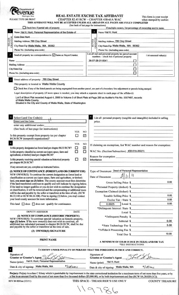 | 3 | 02/25/2011 | WARRANTY D | WARRANTY DEED | HUNT, CORA DEE ESTATE OF | HUNT, HAL H | | | | 119786 | 2011-01759 |