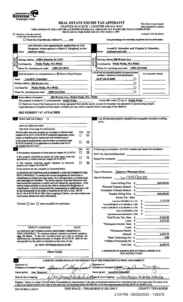 | 1 | 06/26/2020 | SWD | STATUTORY WARRANTY DEED | STEWART ANN | SCHNEIDER LOWELL E & VIRGINIA D | | | $468,500.00 | 139376 | 2020-05955 |