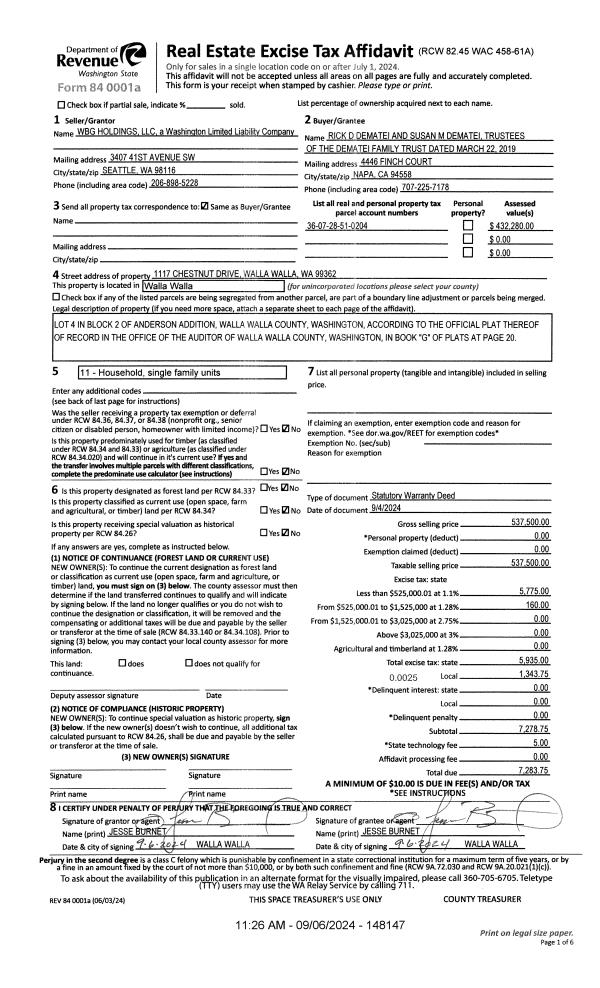 | 1 | 09/06/2024 | SWD | STATUTORY WARRANTY DEED | WBG HOLDINGS | DEMATEI FAMILY TRUST | | | $537,500.00 | 148147 | 2024-05057 |