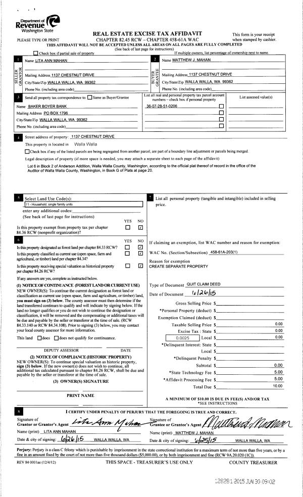 | 1 | 06/26/2015 | QCD | QUIT CLAIM DEED | MAHAN MATTHEW J & LITA A | MAHAN MATTHEW J | | | | 128281 | 2015-05541 |