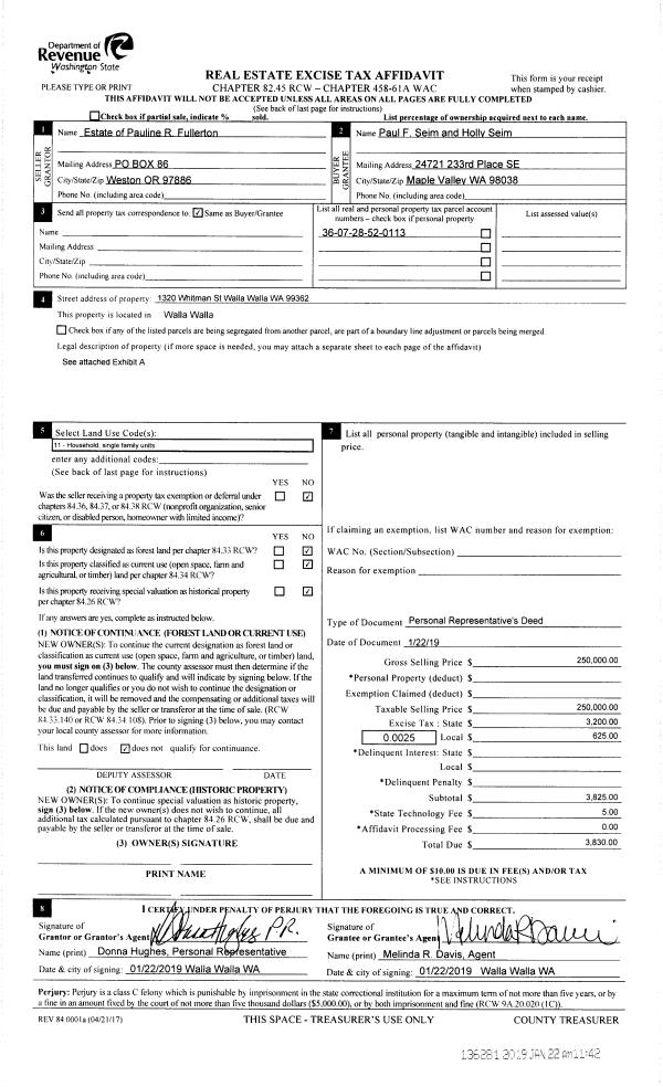 | 1 | 01/22/2019 | DPR | DEED OF PERSONAL REPRESENTATIVE | FULLERTON PAULINE R ESTATE OF | SEIM PAUL F & HOLLY | | | $250,000.00 | 136281 | 2019-00443 |