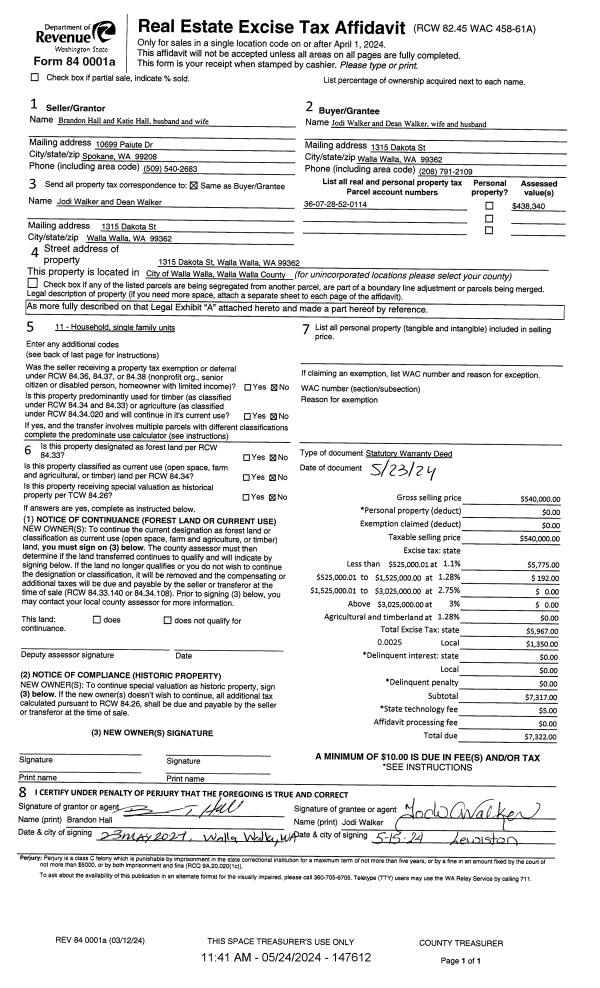| 1 | 05/24/2024 | SWD | STATUTORY WARRANTY DEED | HALL BRANDON & KATIE | WALKER JODI & DEAN | | | $540,000.00 | 147612 | 2024-02775 |