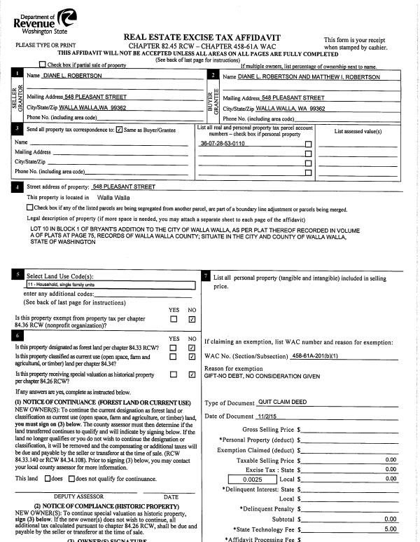 | Mailing Address: | MATTHEW I ROBERTSON 548 PLEASANT ST WALLA WALLA, WA 99362 | % Ownership: | 100.0000000000% |
