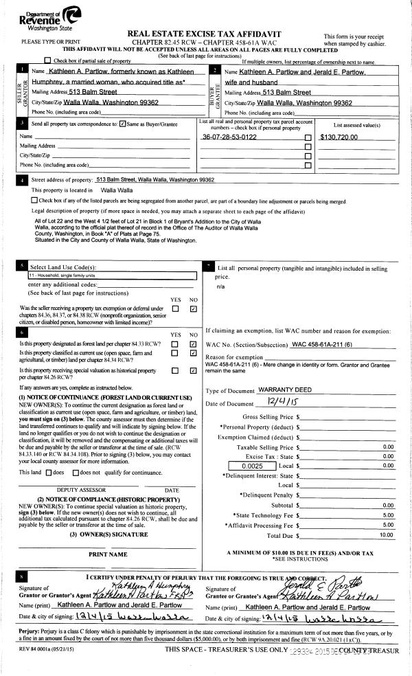 | 1 | 12/04/2015 | WARRANTY D | WARRANTY DEED | PARTLOW KATHLEEN HUMPHREY | PARTLOW JERALD E & KATHLEEN A | | | $0.00 | 129334 | 2015-10679 |