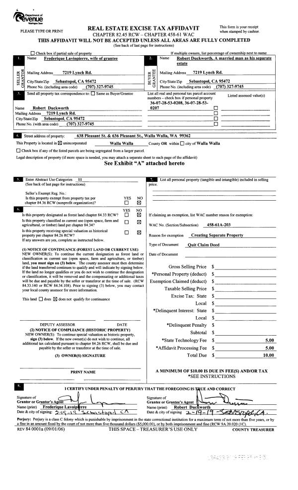 | 1 | 02/25/2019 | QCD | QUIT CLAIM DEED | LAVOIPIERRE FREDERIQUE | DUCKWORTH ROBERT | | 2-PARCELS | | 136433 | 2019-01240 |