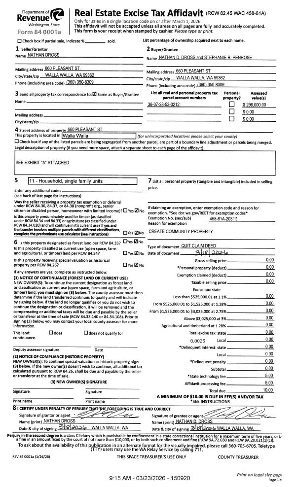 | Mailing Address: | 660 PLEASANT ST WALLA WALLA, WA 99362 | % Ownership: | 100.0000000000% |