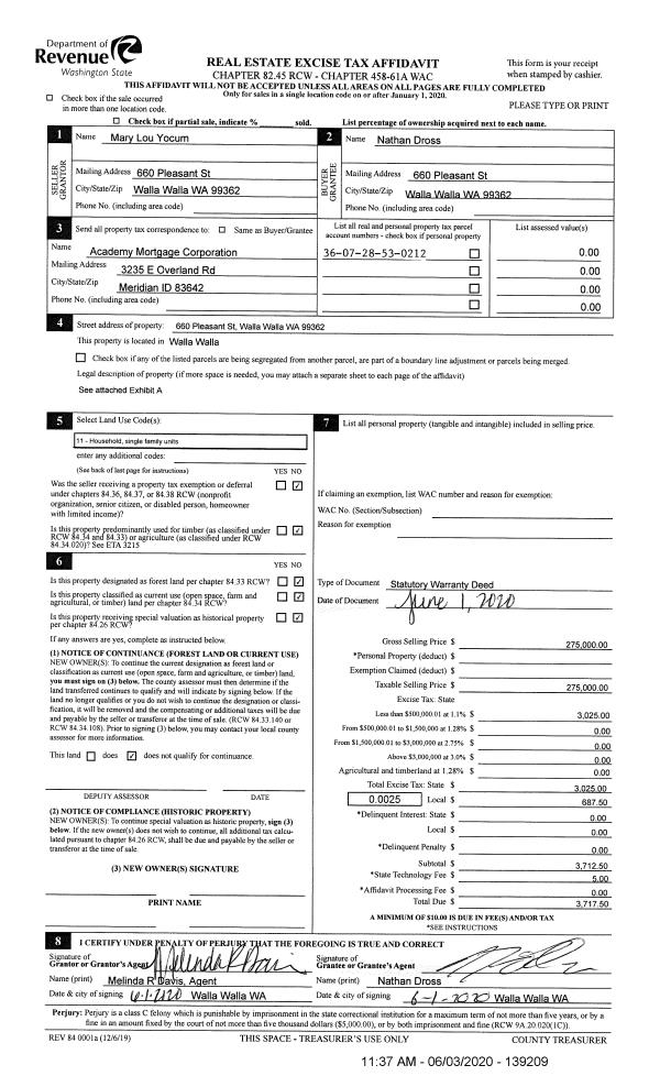 | 1 | 06/03/2020 | SWD | STATUTORY WARRANTY DEED | YOCUM MARY LOU | DROSS NATHAN | | | $275,000.00 | 139209 | 2020-04946 |