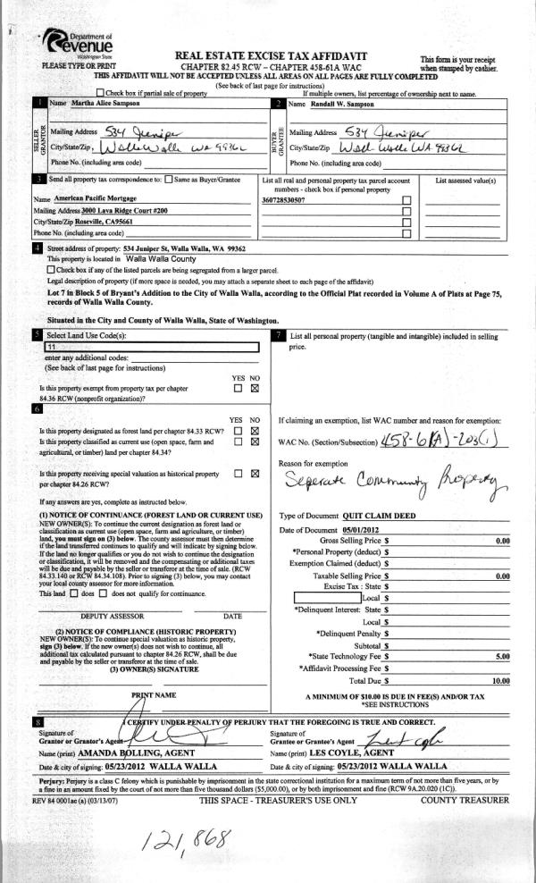 | 2 | 05/24/2012 | QCD | QUIT CLAIM DEED | SAMPSON, MARTHA ALICE | SAMPSON, RANDALL W | | | | 121868 | 2012-04283 |