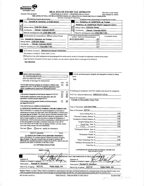 | 1 | 08/19/2015 | QCD | QUIT CLAIM DEED | SAMPSON RANDALL W | SAMPSON RANDALL W TRUST | | | $0.00 | 128655 | 2015-07285 |