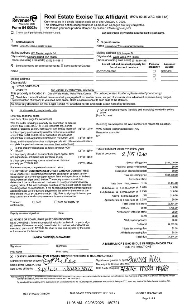 | 1 | 02/06/2026 | SWD | STATUTORY WARRANTY DEED | MILES LINDA M | WEIR BREANA MAE | | | $314,000.00 | 150721 | 2026-00719 |