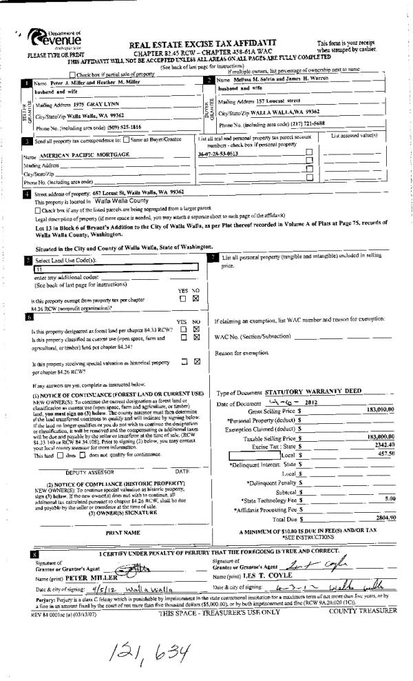 | 3 | 04/06/2012 | WARRANTY D | WARRANTY DEED | MILLER, PETER J & HEATHER M | WARREN, JAMES H | | | $183,000.00 | 121634 | 2012-02749 |