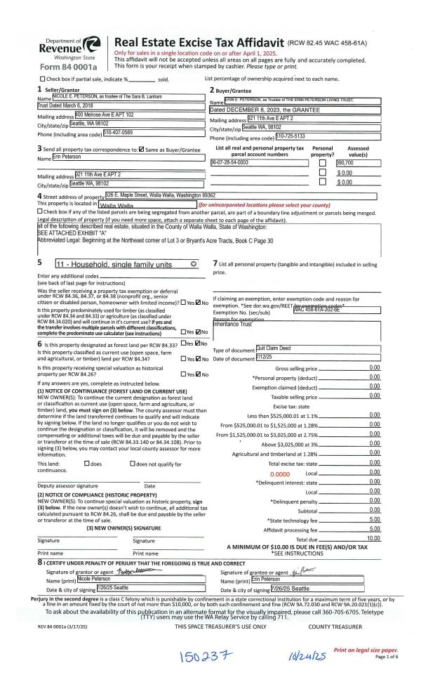 | 1 | 10/24/2025 | QCD | QUIT CLAIM DEED | LANHAM SARA B TRUST | PETERSON ERIN LIVING TRUST | | | | 150237 | 2025-06585 |