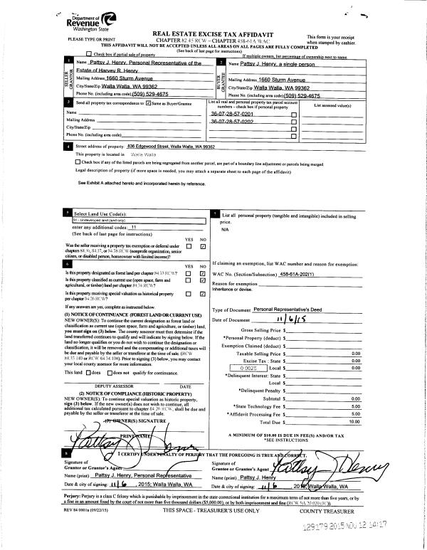 | 2 | 11/06/2015 | DPR | DEED OF PERSONAL REPRESENTATIVE | HENRY HARVEY R & PATTSY J HENRY | HENRY PATTSY J | 2 PARCELS | | | 129179 | 2015-09847 |