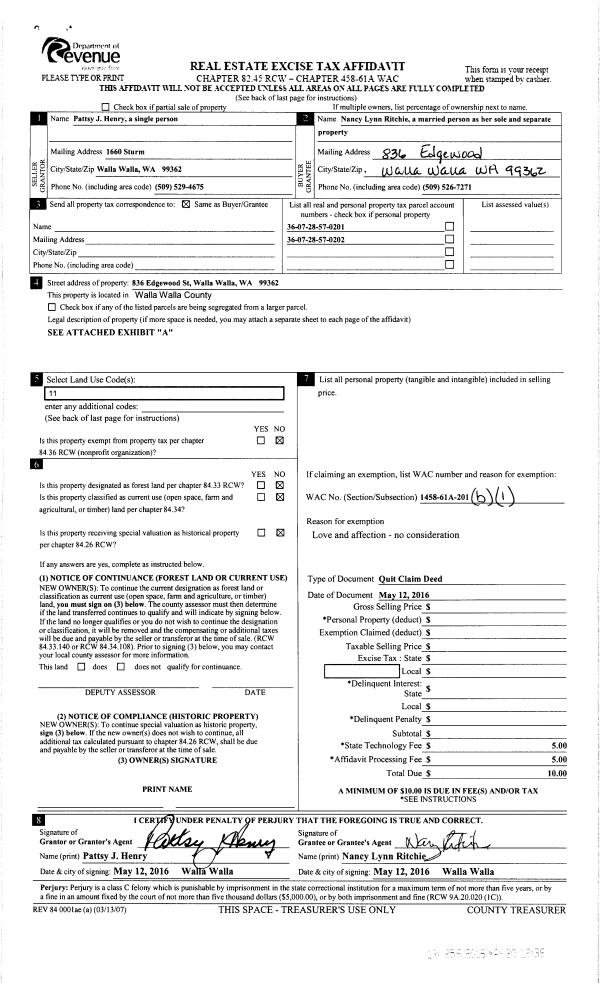 | 1 | 05/12/2016 | QCD | QUIT CLAIM DEED | HENRY PATTSY J | RITCHIE NANCY LYNN | | | $0.00 | 130256 | 2016-03798 |