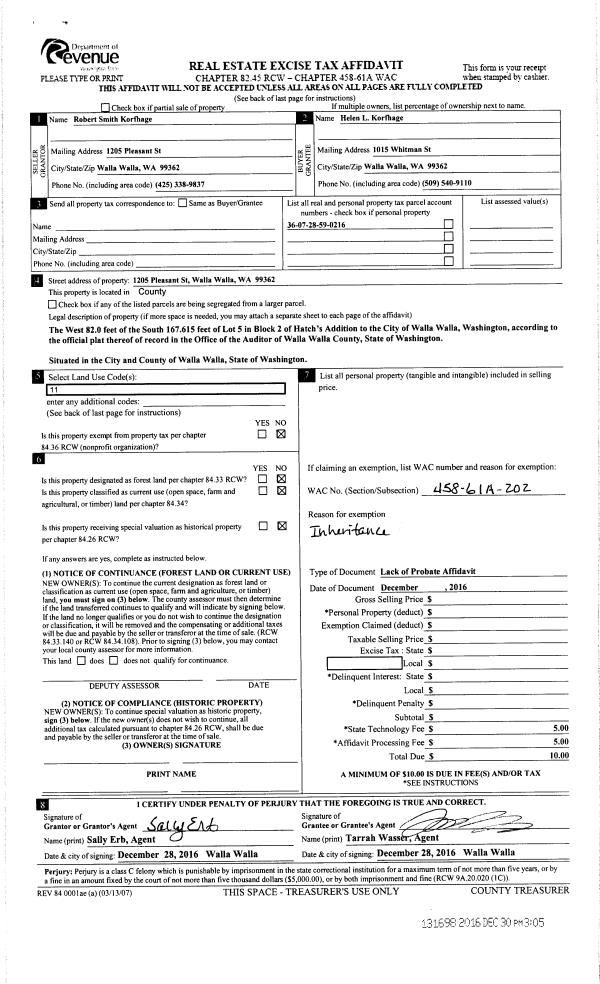 | 2 | 12/30/2016 | LOPA | LACK OF PROBATE AFFIDAVIT | KORFHAGE ROBERT SMITH | KORFHAGE HELEN L ET AL | | | | 131698 | 2016-10810 |
