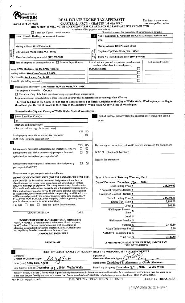 | 1 | 12/30/2016 | SWD | STATUTORY WARRANTY DEED | KORFHAGE HELEN L ET AL | ALMANZAR GUADALUPE E & GISELA | | | $225,000.00 | 131699 | 2016-10812 |