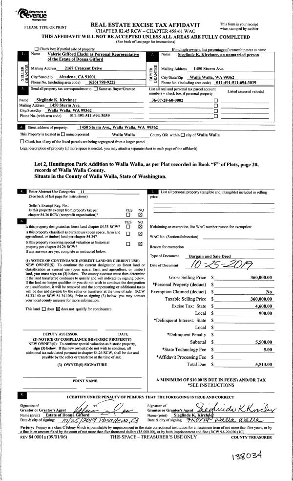 | 2 | 11/07/2019 | BARGAIN & | BARGAIN & SALE DEED | GIFFORD GERALD B & DONNA M | KIRCHNER SIEGLINDE K | | | $360,000.00 | 138034 | 2019-09137 |
