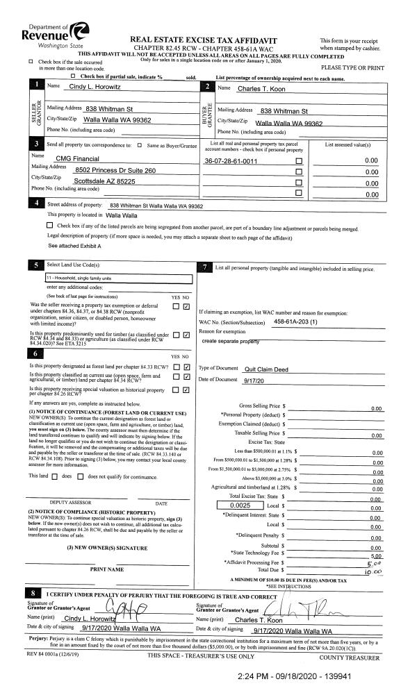 | 1 | 09/18/2020 | QCD | QUIT CLAIM DEED | HOROWITZ CINDY L | KOON CHARLES T | | | | 139941 | 2020-09569 |