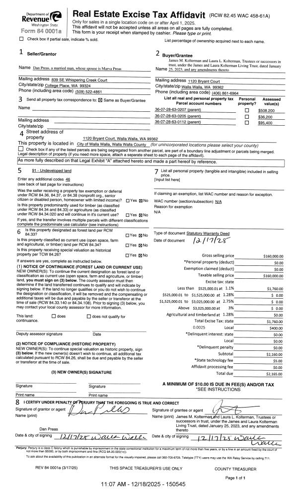 | 1 | 10/12/2021 | WARRANTY D | WARRANTY DEED | FIRST CHURCH OF GOD OF WALLA WALLA | PREAS DAN D | | 5-PARCELS | $700,000.00 | 142657 | 2021-12424 |