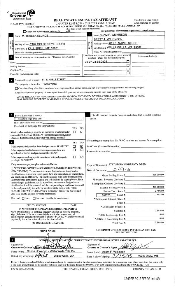 | 3 | 02/28/2018 | SWD | STATUTORY WARRANTY DEED | KLUNDT MARIA T | WILKINSON ADAM F & BRETT A | | | $195,000.00 | 134225 | 2018-01624 |