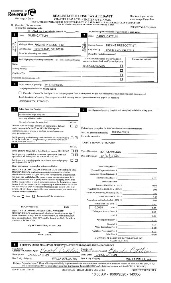 | 1 | 10/08/2020 | QCD | QUIT CLAIM DEED | CATTLIN GILES | CATTLIN CAROL | | | | 140056 | 2020-10370 |