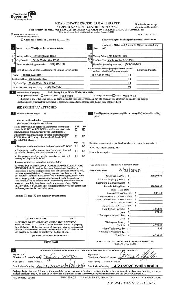 | 2 | 04/24/2020 | SWD | STATUTORY WARRANTY DEED | WAETJE KYLE | MILLER JOSHUA G & AMBER B | | | $350,000.00 | 138977 | 2020-03533 |