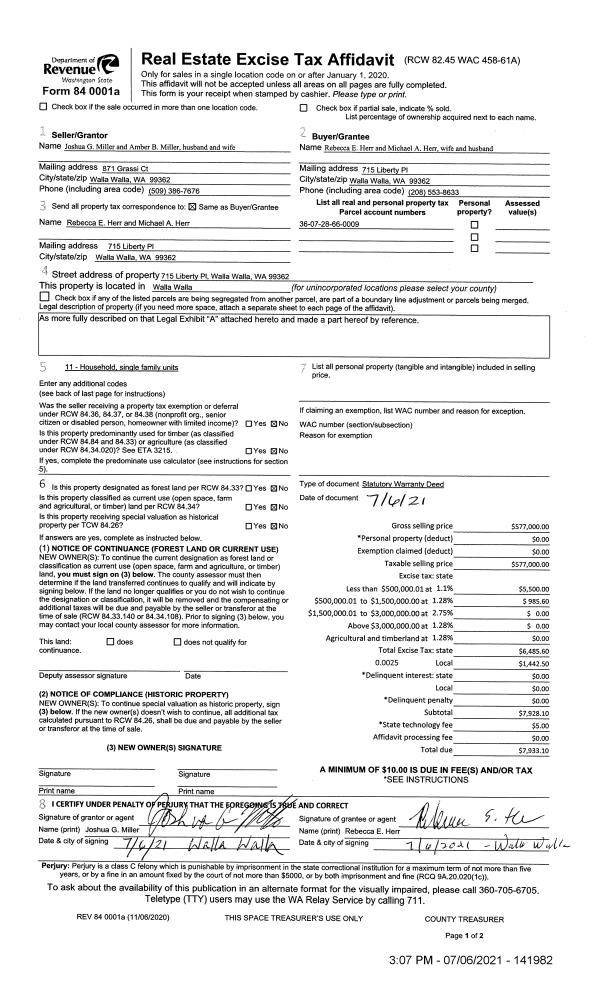 | 1 | 07/06/2021 | SWD | STATUTORY WARRANTY DEED | MILLER JOSHUA G & AMBER B | HERR REBECCA E & MICHAEL A | | | $577,000.00 | 141982 | 2021-08188 |